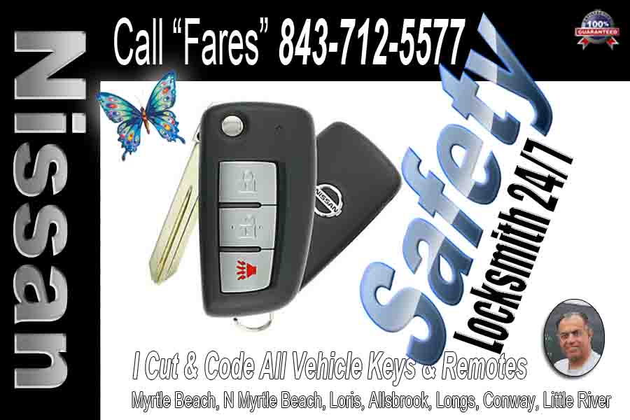 Nissan Flip Key – My van is fitted and stocked with a fully mobile Locksmith Myrtle Beach service system, I can come to you anytime of the day! Since we’re open 24 hours a day, 7 days a week, there’s no need to panic when you’re in a bind. We never charge extra for nights, weekends or holidays, because we know stressful situations never take a break. Some services we offer are car lock out, car lock replacement, car lock repair, ignition replacement, ignition repair, car key extraction, broken lock replacement, broken lock repair, and more! Call and ask for Fares Today (843) 712-5577